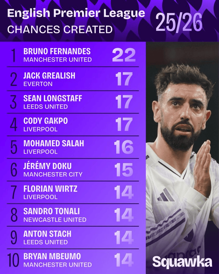 Hupu, ngày 21 tháng 10, Squawka đã đánh giá các cơ hội ở Premier League được tạo ra trong mùa giải này. Tiền vệ B Fee của Manchester United đã tạo ra 22 cơ hội ghi bàn, đứng đầu giải đấu và là cầu thủ duy nhất vượt qua 20 lần. Grealish của Everton, Longstaff của Leeds United và Gakpo của Liverpool đồng hạng nhì với 17 lần; Salah của Liverpool xếp thứ 5 (16 lần).