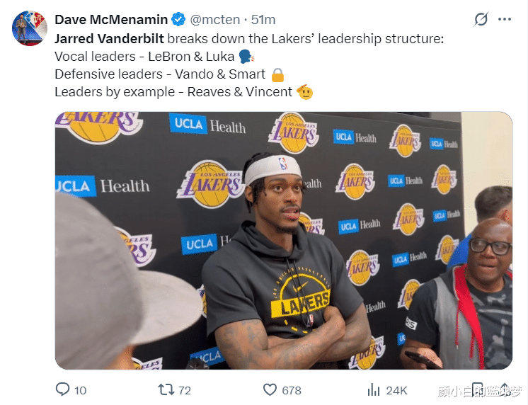 Vào ngày 8 tháng 10, tiền đạo Jared Vanderbilt của Lakers đã nhận lời phỏng vấn sau buổi tập của đội. Ông đã phân tích chi tiết cơ cấu lãnh đạo của Lakers với giới truyền thông: