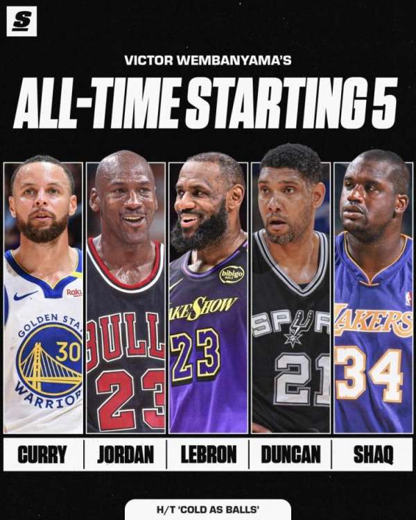 Khi được hỏi về đội hình mạnh nhất trong đầu anh, năm cầu thủ được Wenbanyama đưa ra là: Jordan, James, Curry, O'Neal và Duncan.